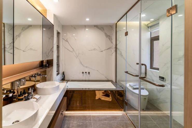 中央的庭院更是下了“重本”,名贵植物环绕,原石雕塑与水景相互辉映,点缀上流水小桥,再搭配上飞檐翘角的凉亭,中式“上善若水”的境界毫不违和地糅于一处,每一角都美得摄人心魄。