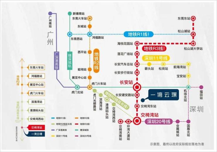 占位大湾区交通核芯枢纽之上,双TOD加持,畅享粤港澳1h黄金生活圈。约1km即到R3线长安建安路站(规划中),约2.8km即到R2线交椅湾站(建设中),约2km直达穗深城轨长安站,3站长安中心区,6站松山湖,一站前海一轨东莞CBD,约1小时覆盖广深机场、香港机场、港澳码头,擎领湾区未来生活。