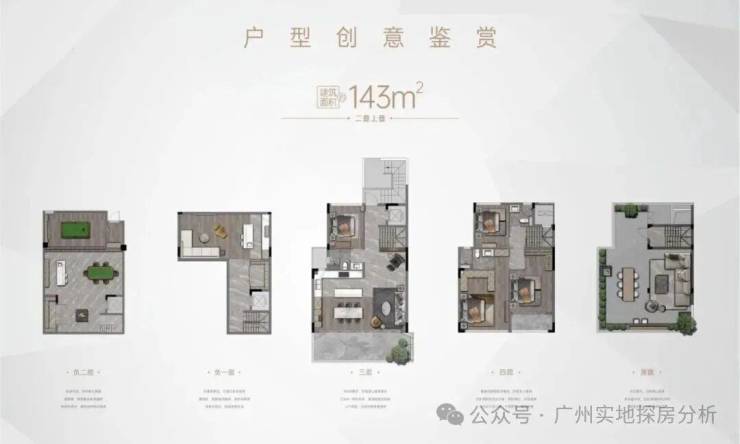 项目楼栋分布和户型:项目除了4栋R1-R4栋政府配建房以外,对外销售的产品涵盖叠墅、小高层和高层,户型建面均为143㎡。中间一线临湖区由18栋4-6层的叠墅组成一梯一户,合计188套;右侧为2栋9层高的小洋房,两梯两户,都是独门独户。同时还有4栋保障性住房,左边是2栋16-17层的小高层,两梯四户。