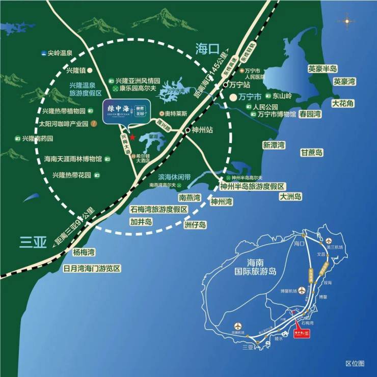 绿中海所处的兴隆地区,以兴隆与石梅湾之间相连的兴梅大道为轴线,而绿中海恰好坐落在兴梅大道中段。