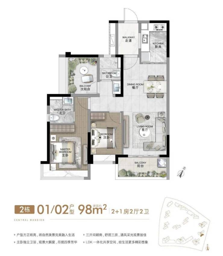 建面约98㎡ 3房2厅2卫,豪华主卧套房,超大270°转角飘窗,三开间朝南。约10m大尺度南向采光面。