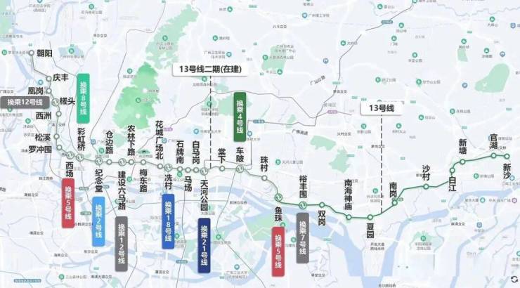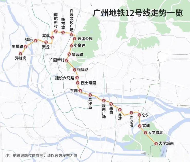 12号线(预计2024年通车)-广州换乘之王,广州市第一条无人驾驶地铁线路,与十数条轨道线无缝换乘,共经过白云文化广场、烈士陵园、二沙岛、赤沙等17个换乘站,可直达大学城,连通白云、越秀、海珠、番禺四大区域。