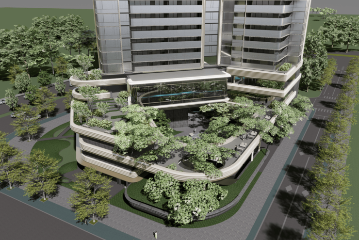 为打破城市与自然的界限,设计突破常规手法,通过围合的建筑体量划分出前庭后院的格局。前庭利用登高面设置酒店式落客区,连接城市繁华之口;后园通过层层退台空间,将山林、水体、植被等自然元素引入小区,并内置丰富的公建配套和休闲娱乐设施,满足多元的生活需求同时,让住客在城市中静享自然,于自然之中不离城郭,不出城郭而获山林之怡,身居闹市而享林泉之趣。