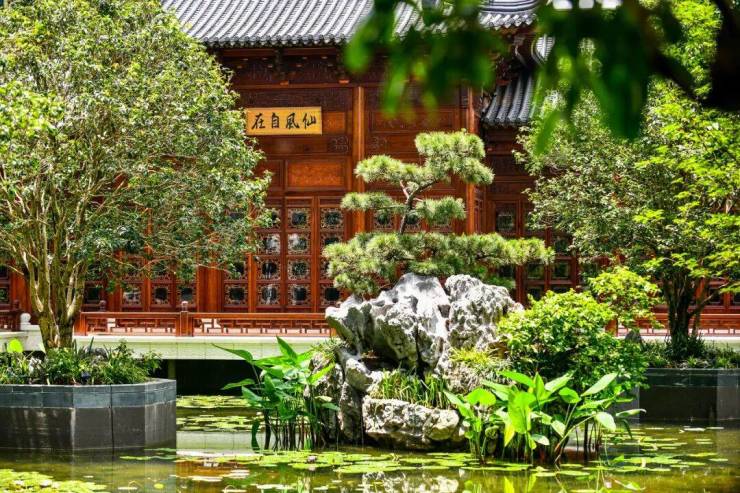 就如可以被视为雏形的夕露园一样,大型水景园林中以树池形式种植乔木与池内各类水生绿植、形态各异的太湖石相映成趣。