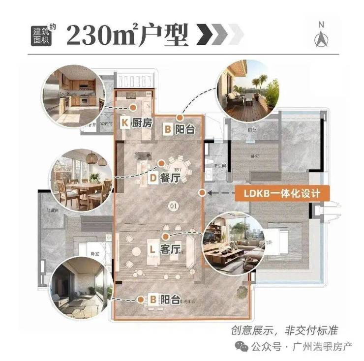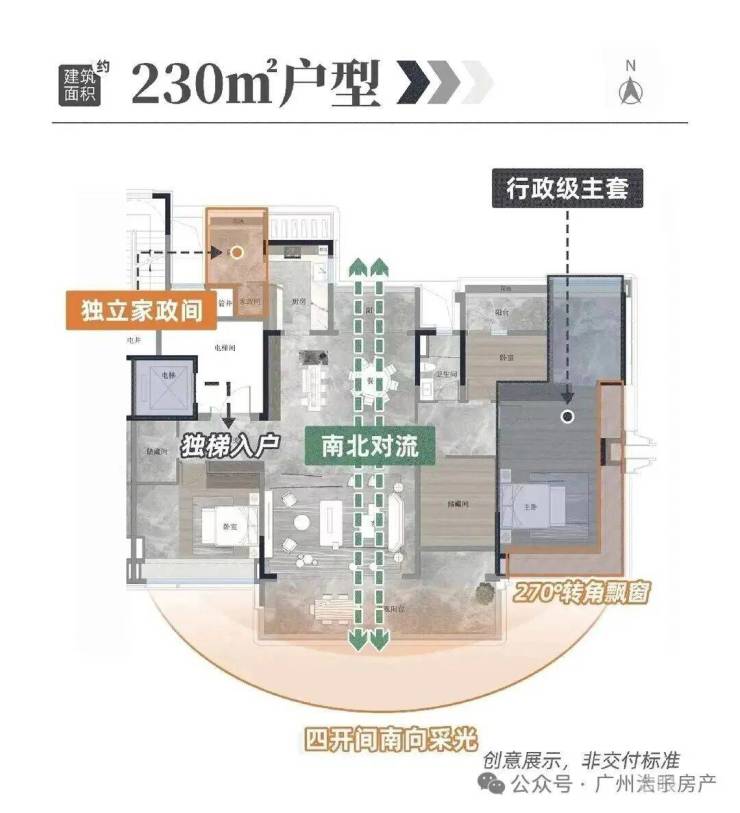 230平户型拥有私家电梯厅、双主套、独立佣人房、南北对流、LDKB大方厅、主卧L型270°飘窗等,大大提升了整体的空间体验。