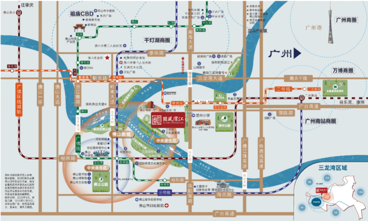 国风滨江傲立三龙湾板块,处于三龙湾与佛山新城的双核芯辐射圈内。这里是政府斥资3000亿重点规划打造的“广佛极点”,尽享双核芯带来的无限利好,与佛山新城、千灯湖、广州南站3大CBD互联互通,以战略级的占位,对话大湾区未来,发展潜力不可估量。