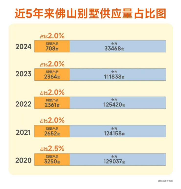 在房地产市场中,稀缺性往往决定着房产的价值。国风滨江作为周边在售的一手楼盘,其稀缺性不言而喻。近年来,佛山大平层项目如雨后春笋般涌现,而城央院墅却因别墅用地停止审批、“限墅令”从严而愈发稀少。市场上不缺少房子,但核心区的房子总是供不应求。贝壳数据显示,全市352个在售项目中,别墅项目仅有16个,占比仅约4.5%。不止选择少,近五年佛山别墅供应也在逐渐减少。2024年出现断崖式下跌,仅供应708套,在全市新房供应中占比仅2%。