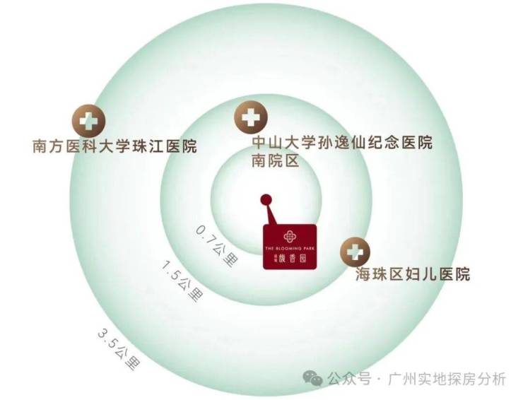 约750米处有中山大学孙逸仙纪念医院(三甲),约1.5公里有海珠区妇儿医院,约3.5公里有南方医科大学珠江医院、广州医科大学附属第二医院,医疗资源丰富。