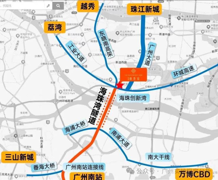 道路交通:临近工业大道、南洲路、广州大道、洛溪大桥、海珠湾隧道(在建)等交通干道,海珠湾隧道建成后,15分钟可直达广州南站,实现15分钟珠江新城/琶洲双CBD生活圈。