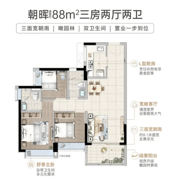 88㎡三房两卫是毛坯现房尾货,总价199万起,今年买今年就能住,不用等漫长的交房期,空间布局方正,没有浪费面积,预算有限的刚需首套家庭可以重点考虑。