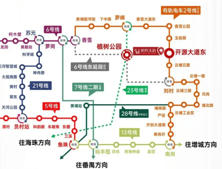 自驾的话,开源大道、开创大道都是主干道,30分钟到天河核心商圈,40分钟能到白云机场,不管是日常上班还是节假日出行都挺方便。而且规划中的地铁6号线东延段和23号线会在附近的植树公园站交汇,以后交通只会更便捷。