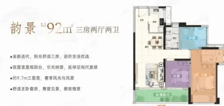 92㎡三房两卫是二期新规户型,分北向和南向,北向总价240万起,南向260万起,新规设计让房间更显开阔,采光和通风都不错,居住舒适度更高。