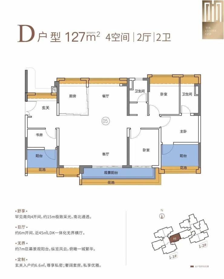 约107㎡四房: 南向设计,采光充足,总价在580-660万之间。