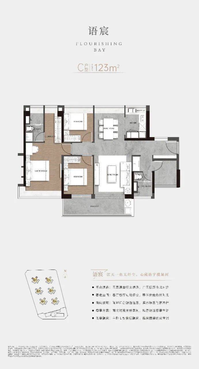 C户型:建筑面积约123㎡,约26㎡南北对流主卧套房,金融岛唯一阳光玄关,4.5开间朝南,可改双套间。