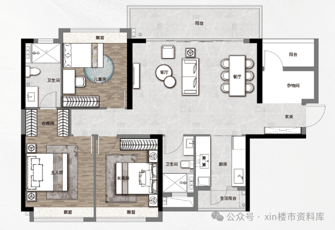 全屋飘窗面积全赠送,双阳台面积半赠送,实用率超80%。