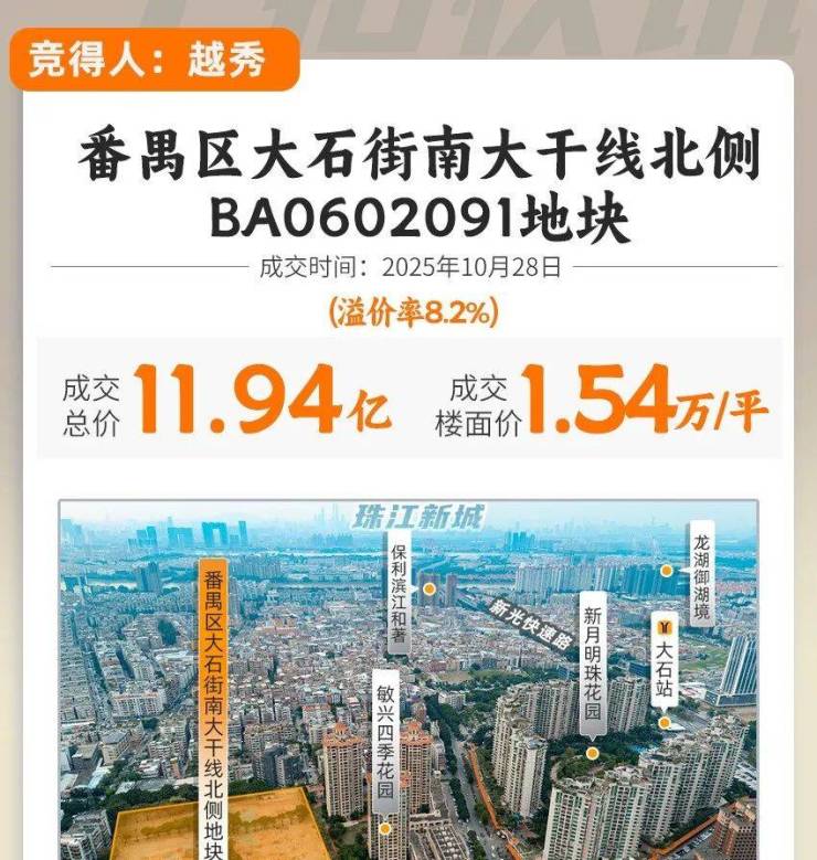 2025年10月28号,越秀地产以总价11.94亿元拿下番禺大石鸿图工业园地块,名义楼面价1.54万元/平,溢价8.15%。
