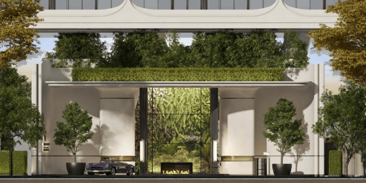 门楼车道前打造水景端景,寓意聚财,白色弧形立柱,更显庄重,搭配金色门厅天花板和灯光,高级感一下子就上来了。