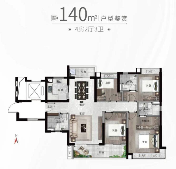 户型设计:主力户型为75-140㎡的三至四房,采用三梯六户设计,部分户型实现独梯入户,空间布局合理,注重采光和通风,部分户型设有景观阳台、入户花园等,提升居住舒适度。