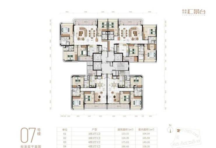 项目由14栋12层小高层组成,产品涵盖123-352㎡三至五房,共8类户型,户型实用率约82-84%