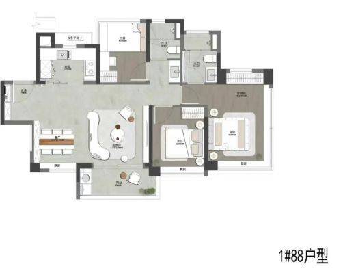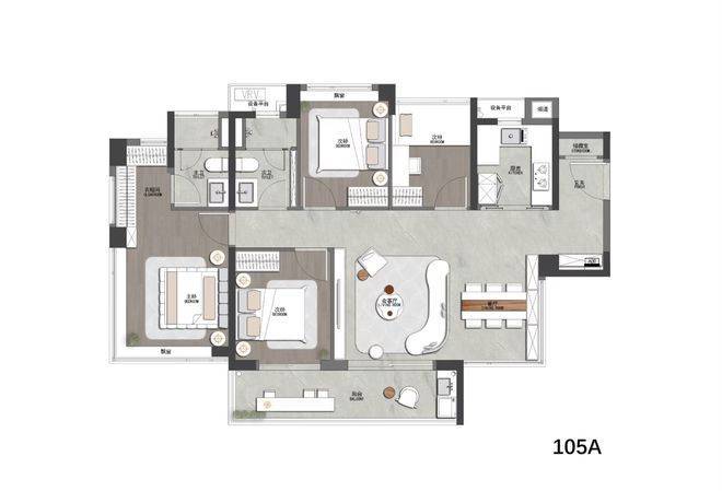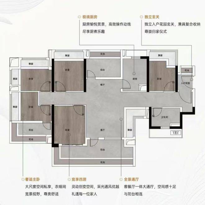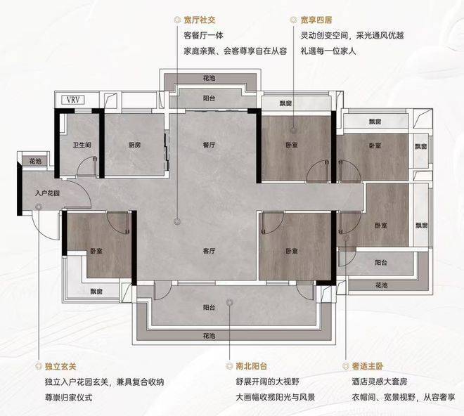 约105㎡真四房:四开间朝南,南向面宽达12.8米,主卧配备独立衣帽间与270°环幕飘窗,尺度感媲美改善大宅;