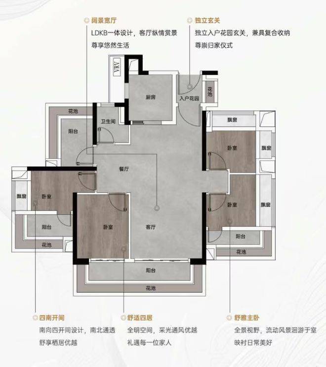 约102㎡四房:采用LDKB一体化设计,会客空间开阔,南向面宽充足,搭配高赠送花池与飘窗,实用与颜值兼备;