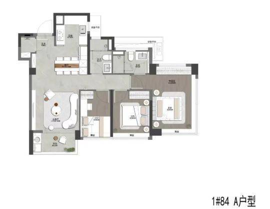 约84㎡三房两卫:全南向布局,采光通风俱佳,满足刚需家庭基础居住需求;