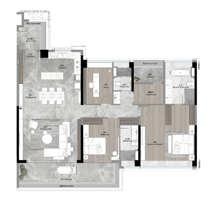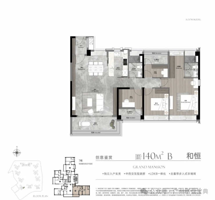 建面140平四房,动静分区、全屋全明设计,入户玄关,约8米双连宽景阳台,LDKG一体化设计,主卧小家化。
