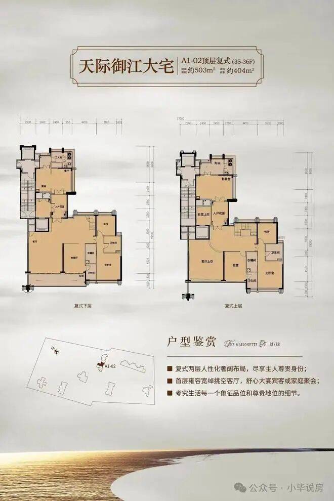 双主卧套房:380㎡以上户型配备双主人套房,均设置衣帽间与景观卫浴
