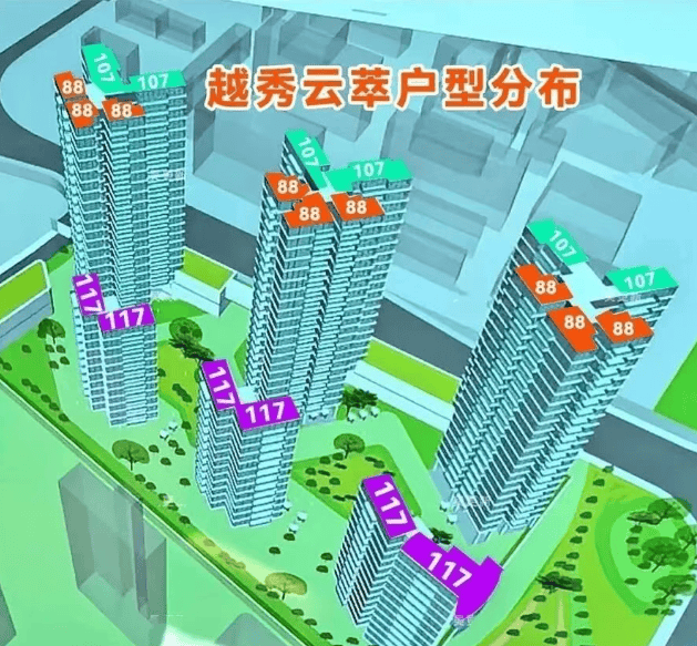越秀云萃项目由知名开发商越秀地产打造,占地面积约为1.7万平方米,建筑面积约4.2万平方米,容积率约为2.5。项目提供面积段为建面约87-106-11日讯平方米的户型,共有391户,层高约3米,层数在12至22层之间。建筑形态包括南向板楼和小高层,规划了6栋楼,其中3栋是21层高的塔楼,另外3栋则是12至13层的小高层板楼。