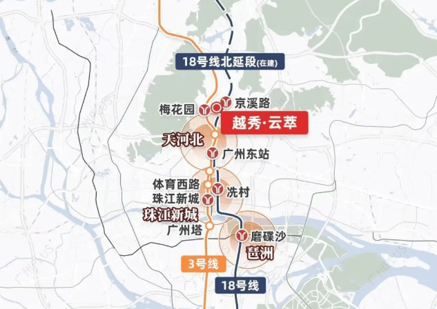 项目位置极为便捷,距离珠江新城直线距离约5公里,自驾可经由广州大道或沙太路快速到达珠江新城CBD。公共交通方面,家门口就是地铁18号线京溪路站,步行约800-900米即可到达3号线梅花园站,交通网络发达,方便快捷地连接城市各主要商圈和生活圈。