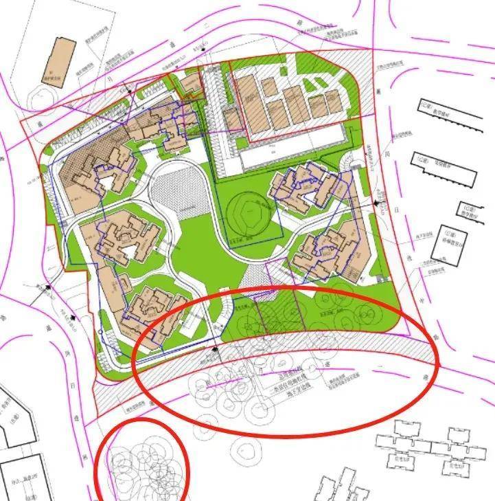 3、所在地块上有很多棵古树,粗略一数,光是出现在图面上的就有50多棵。