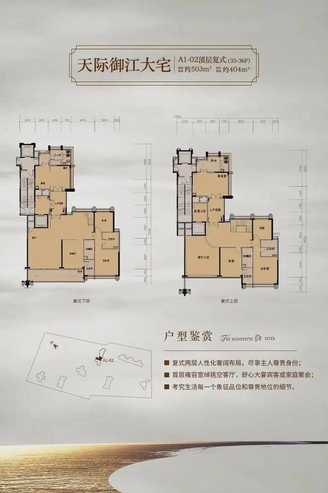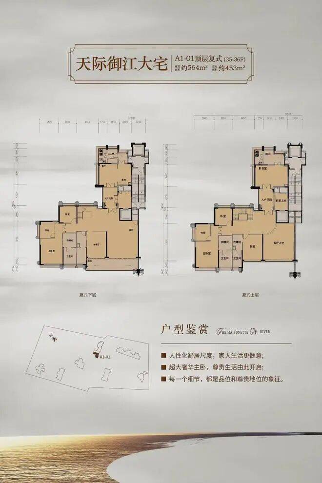 楼王华玺:A6栋1栋约32层高的版式高层洋房。四梯两户,户型面积约478㎡的超奢华五房户型。与B11同为楼王单位,户户南北通风对流,采光景观极佳,一线无敌江景;每户均特设私家入户花园,超大开间,超大阳台。