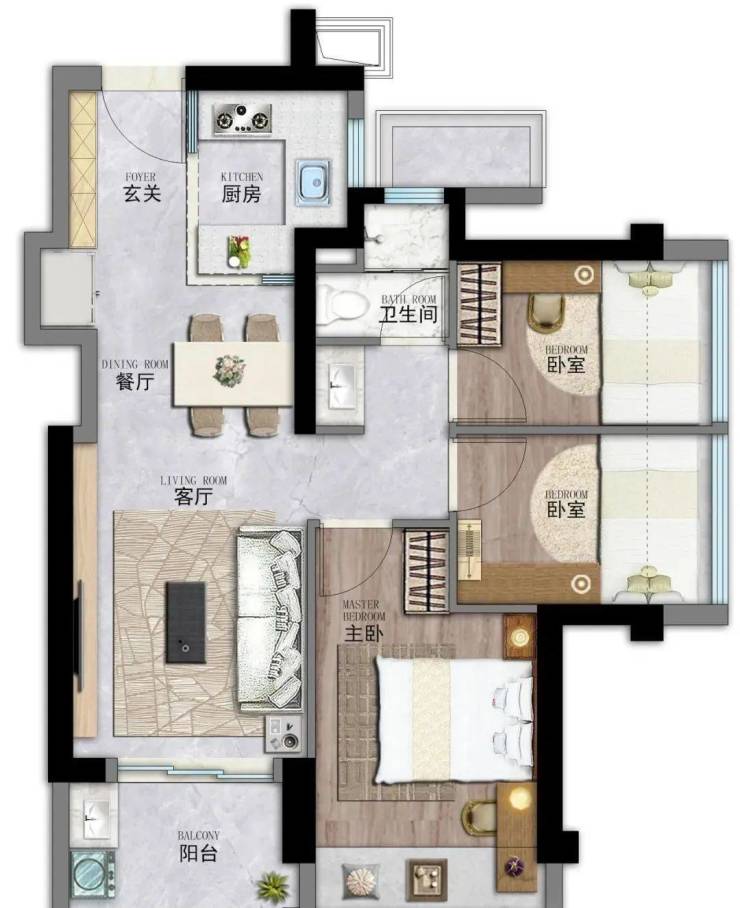 76㎡的3房2厅1卫,设计的是竖厅格局,进门入户玄关,客厅3.05米开间,LDKB一体化,S墙设计预留冰箱位,3个卧室分别做到了2.95米/2.3米/2.15米的宽度,U型厨房,卫生间三段式分离,还带1个设备平台可以使用,得房率约:89%(包含赠送),阳台有朝东北、东南或西南向。