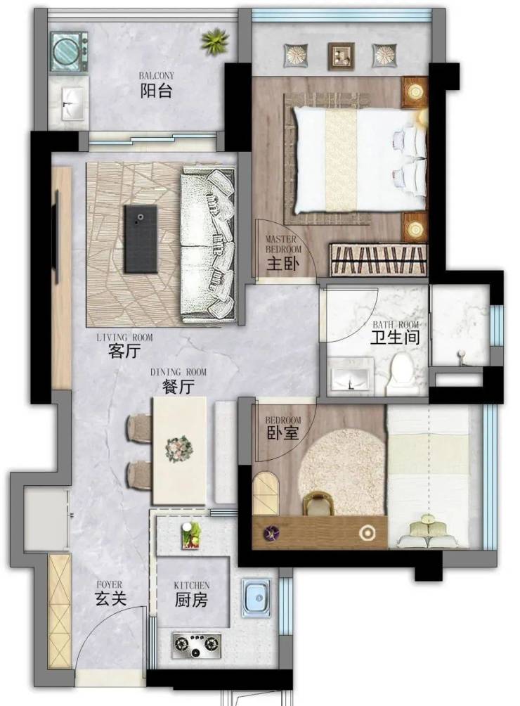 63㎡的2房2厅1卫,设计的是竖厅格局,进门入户玄关,客厅3米开间,LDKB一体化,S墙设计预留冰箱位,2个卧室分别做到了2.8米/2.35米的宽度,U型厨房,卫生间干湿分离,得房率约:88%(包含赠送),阳台西北朝向。