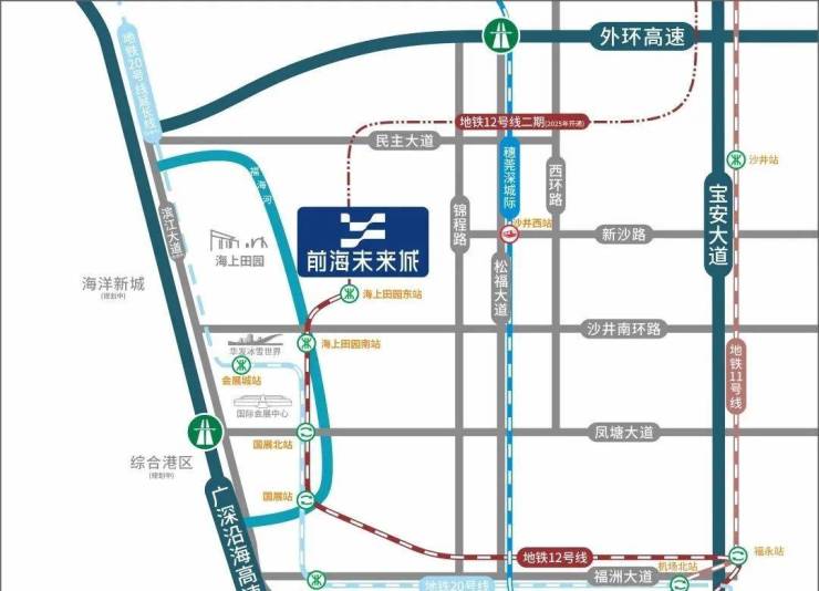 交通配套:卓越前海未来城,家门口就是12号地铁线“海上田园东站”,一期是最靠近地铁站的,2站到国展北站可以换乘20号线,6站到福永站还可以换乘11号线,快速通达宝中,南山区。