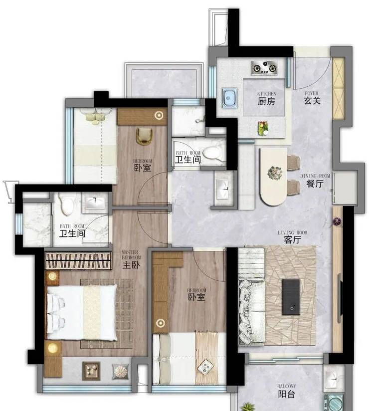 86㎡的3房2厅2卫,设计的是竖厅格局,进门入户玄关,客厅3.2米开间,LDKB一体化,S墙设计预留冰箱位,三开间朝南,3个卧室分别做到了3米/2.4米/2.4米的宽度,U型厨房,公卫三段式分离,还带1个设备平台可以使用,得房率约:89%(包含赠送),阳台有东南或西南朝向。