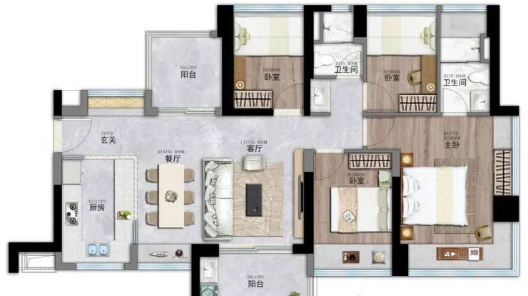 113㎡的4房2厅2卫,可以做5房,设计的是横厅南北通透格局,进门入户玄关,客餐厅5.4米开间,餐客厅一体化,五开间朝南,5个卧室分别做到了3.85米/2.75米/2.55米/2.4米/2.3米的宽度,U型厨房,公卫三段式分离,得房率约:96%(包含赠送),阳台主朝东南或西南向