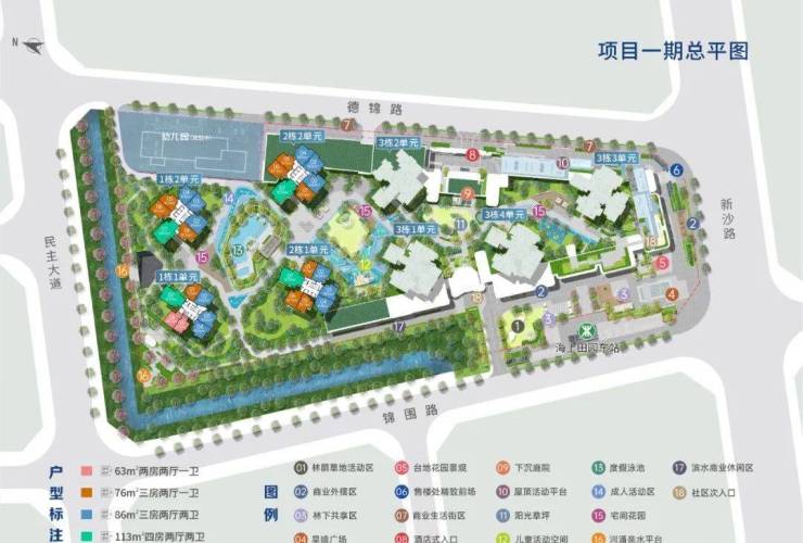 共由8栋45-47F住宅组成,分ABC区建设,其中A区1栋1单元47F,1栋2单元46F,B区2栋1单元47F,2栋2单元46F,C区3栋1/2/4单元47F,3栋3单元45F,4栋是1所9班制幼儿园。