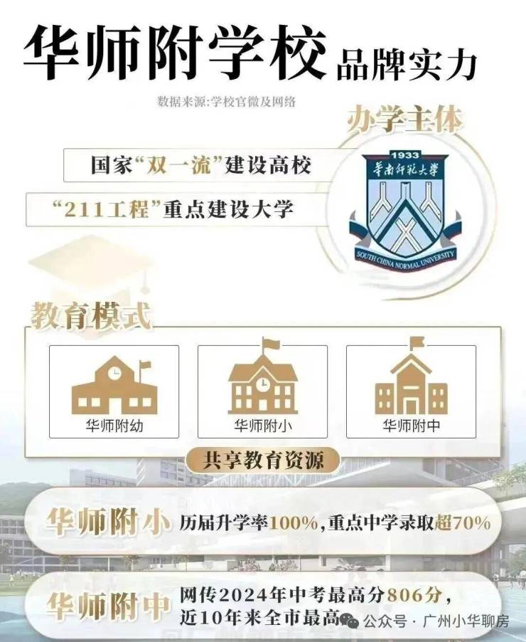 华师附是华南师范大学附属学校,该校是双一流、首批国家211工程大学,有强大的教育背景和资源。华师附小升学率100%,重点中学录取率超70%;