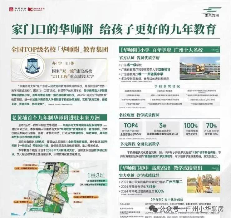 未来方洲楼下就有一所12班的幼儿园,一所36班的九年一贯制学校,可以做到目送式的接送方式,这所学校将引入老黄埔首个9年制“华师附”教育体系,现在已经正式官宣