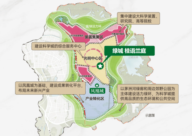 光明中心区以科学公园为规划核心,打造深圳北部中心标杆城区。绿城桂语兰庭位于光明中心区,科学公园旁,地脉天生的稀贵属性,让万物皆备于此。
