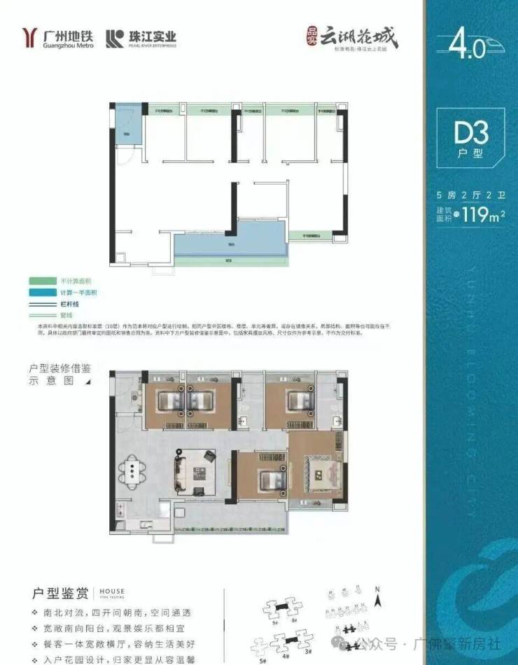 建面约119m² 4+1户型,南北对流