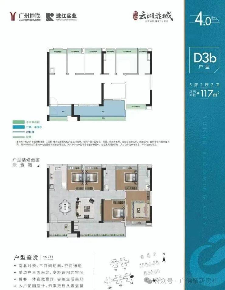 建面约117m² 4+1户型,南北对流