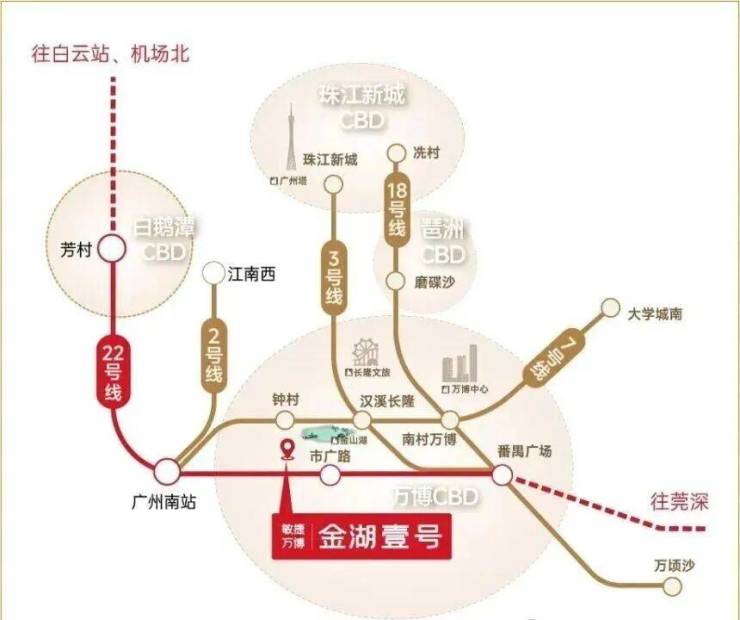 交通出行方面,项目周边有多条地铁线路覆盖,经高德地图实测,距离地铁 18 号线南村万博站约 600 米,步行 8 分钟可达;距离 7 号线万博站 D 出口约 800 米,22 号线市广路站也在 800 米范围内,通过 18 号线两站可到冼村,前往珠江新城十分便捷。