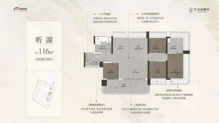 148-149㎡四房配备 LDKG 一体化设计,南向采光面可达约 16 米,部分房间能直接看到湖景,空间利用率较高。