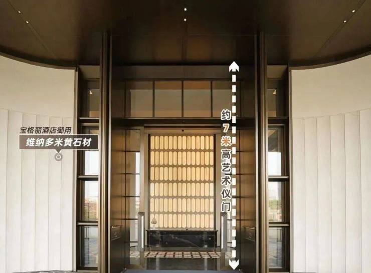 一进大门,整个入户大堂以宝格丽酒店设计风格为灵感,每一个细节都透出映射质感。约7米高的艺术移门辅以奢石弧形墙面,以强烈的仪式感,勾勒通往越秀·万博和臻的“玄关”。