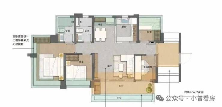 建面89平四房,该户型入户花园约12平,竖厅设计,约6.3米的宽景阳台链接了次卧,还能该做5房。