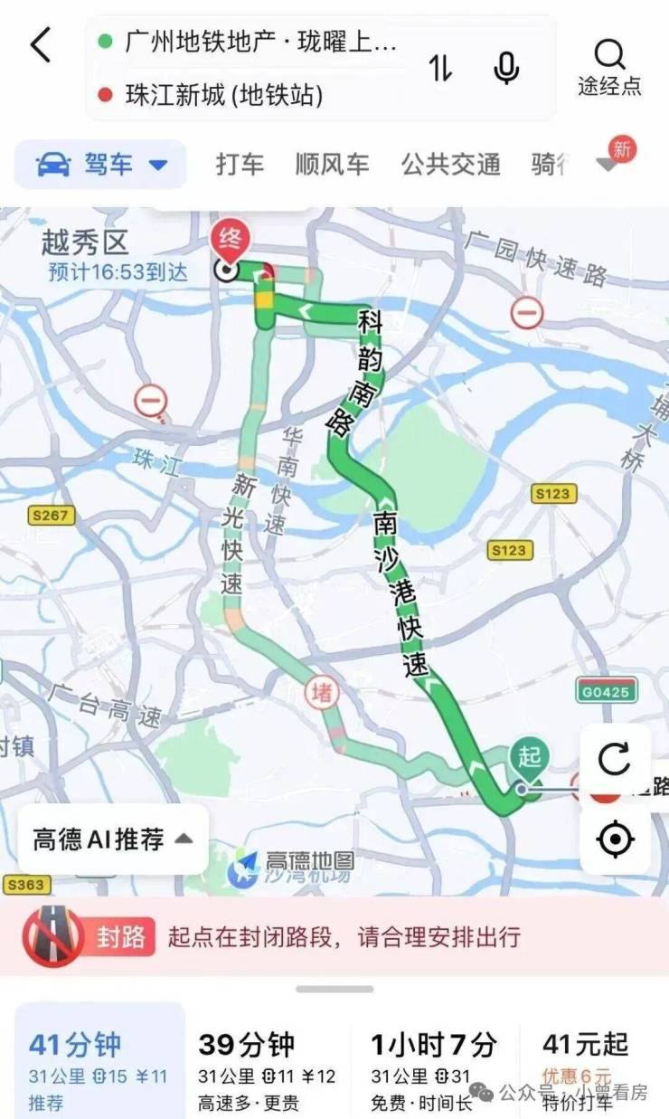 自驾的话也是非常方便,项目距离南沙快速港仅900米,附近还有亚运大道,接下来小何就给大家实测一下自驾或地铁通勤珠江新城、琶洲需要多久:
