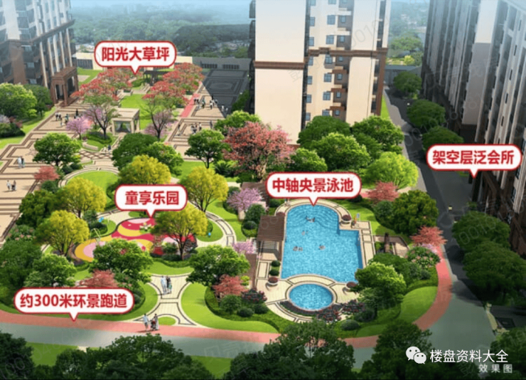 1.项目配有近300米环形跑道、中轴央景泳池、架空层泛会所、童享乐园、阳光大草坪、最大约75米的阔景绿廊等全年龄段轻奢园林配套。