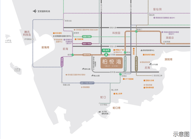 交通方面:·多维路网:东滨路、南海大道、南山大道、广深沿江高速、月亮湾大道、滨海大道等。